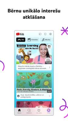 Katrs bērns ir unikāls, un YouTube Kids to respektē, piedāvājot personalizētas satura filtrēšanas iespējas. Vecāki var pilnībā pielāgot katra bērna profilu, nodrošinot piekļuvi tikai tam saturam, kas atbilst viņu vecumam un attīstības līmenim. Izvēlieties režīmu "Pirmsskola", lai palīdzētu pašiem mazākajiem apgūt alfabētu un veicināt viņu dabisko interesi. "Jaunāki bērni" režīms atver durvis uz dziesmām, animācijām un "dari pats" projektiem, paplašinot bērnu redzesloku. Vecākiem bērniem ir pieejams "Vecāki bērni" režīms, kas sniedz iespēju atklāt populāru mūziku un spēļu video. Savukārt ar "Tikai apstiprinātais saturs" vecāki var manuāli atlasīt konkrētus video, kanālus vai kolekcijas, garantējot visprecīzāko satura kontroli.