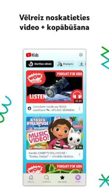 YouTube Kids palīdz bērniem droši izpētīt viņu unikālās intereses. Lietotne piedāvā vecākiem uzticamu video saturu ar viegliem navigācijas rīkiem. Personalizējiet profilus ar satura filtriem, lai veicinātu bērnu iztēju, mācīšanos un pašapziņu viņiem piemērotā tempā.